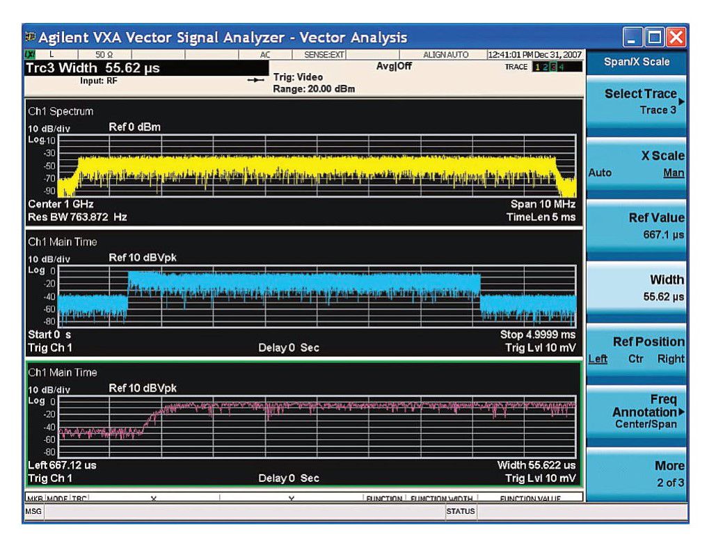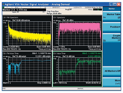 Figure 4. PM demodulation used to show phase stability of the burst at turn-on; by coupling markers to an expanded time domain trace, we can see that data is sent prior to the phase settling out to a stable value after the burst turn-on occurs.One of the biggest differences between vector signal analyzers and spectrum analyzers is that all measurements and displays begin with sampling the signal in the time domain. All measurements provided by the VXA application are derived from this sampled time series data and made available for display. Because of this, you can independently display any available information in any trace window, at any time.