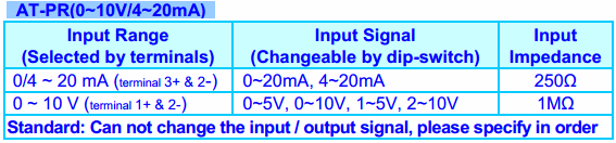 Output: 0~5V / 0~10V / 1~5V / 2~10V / 4~20mA / 0~20mA changeable by dip switches and terminals
