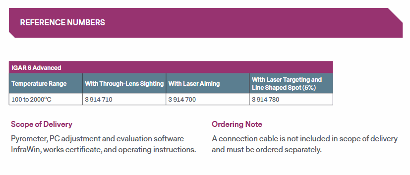 - Scope of Delivery: Pyrometer, PC adjustment and evaluation software InfraWin, works certificate, and operating instruction.
