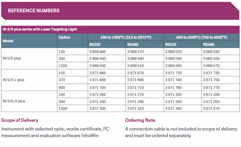 - Scope of Delivery: Instrument with selected optic, works certificate, PC measurement and evaluation software InfraWin