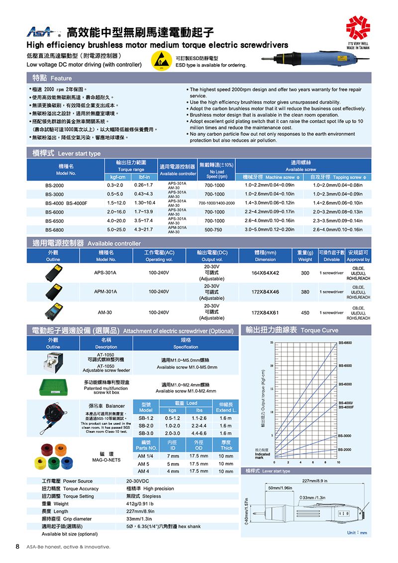 ASA BS-4000 Full-auto shut off electric screwdriver - Brushless motor (1.5-12kgf-cm, 1/4") | EMINKH.COM