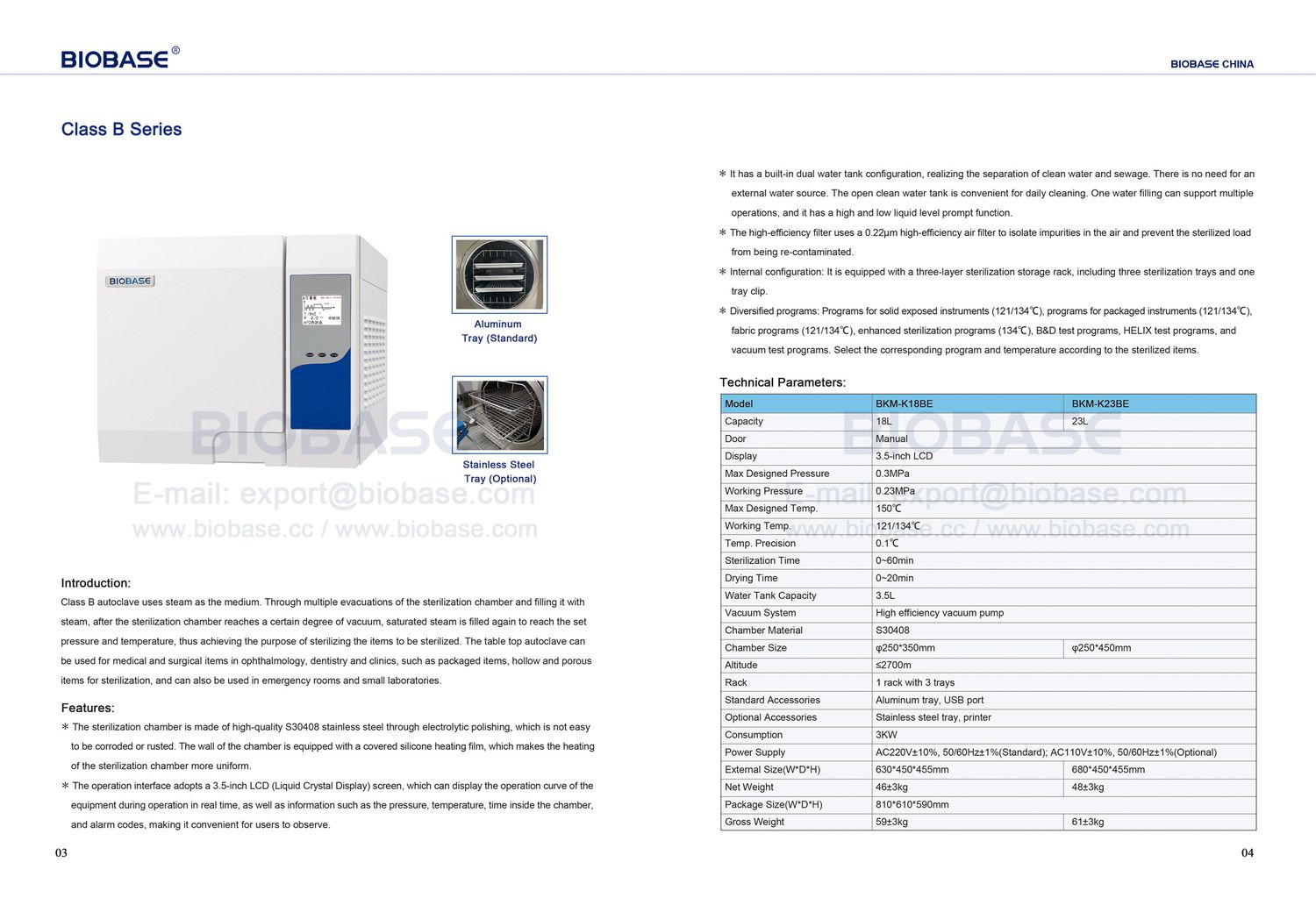 Optional Accessories: Stainless steel tray, printer