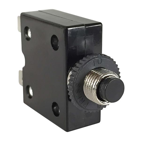 Carling Technologies CLB-103-11A3N-B-A Thermal 1-pole, Push-To-Reset Button, 125-250 VAC/ 32 VDC 10 amp circuit breaker, interrupting capacity 0.250 Tab (Q.C.) terminals M11 Front Panel Metal Bushing with Round Plastic Nut UL 1077 Recognized cUL UL 1500 Recognized