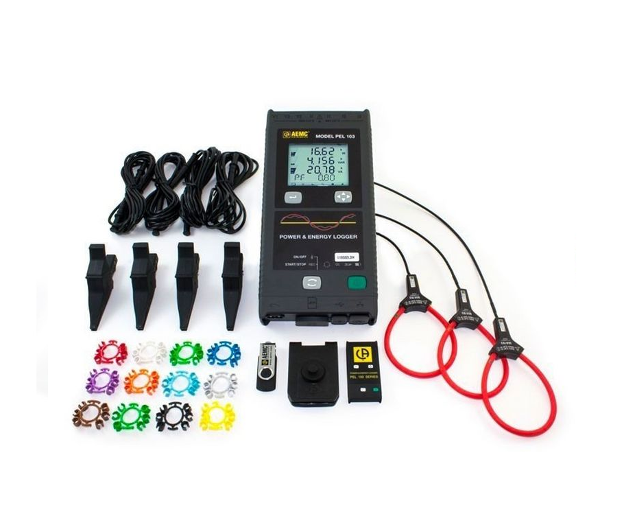 State at delivery:PEL103 power and energy logger, 3 MA193 (250mm 10kA), 4 measurement leads (straight banana / straight banana – 3 m long – black), 4 crocodile clips (black), 1 SD card (2 GB), 1 set of rings and inserts (for ends of leads and current sensors), 1 mains cable, 1 USB cable (Type A / Type B), 1 MultiFIX mounting systems, 1 operating manual (on CD), 1 bag, 1 safety datasheet, PEL Transfer PC software, 1 quick start-up guide, 1 SD-USB adapter.