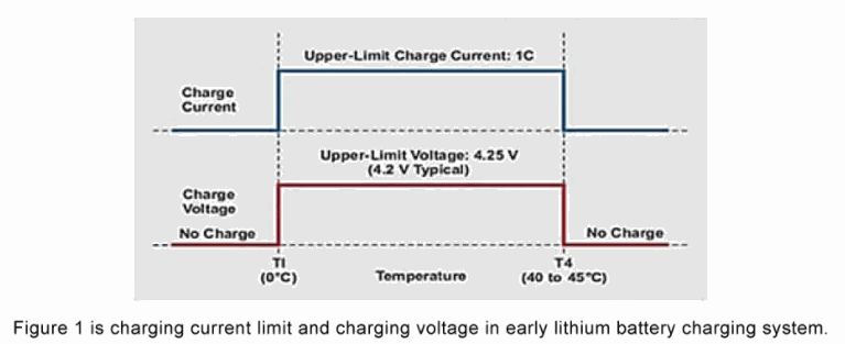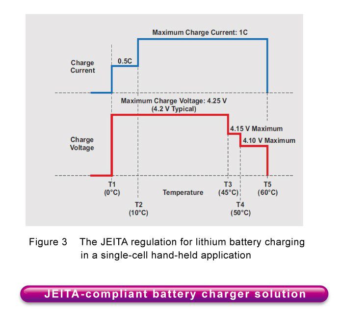 Likewise, Figure 3 shows the JEITA regulation for lithium battery charging in a single-cell hand-held application where the charge current and charge voltage are also a function of battery temperature. The 4.25V maximum charge voltage represents the maximum output voltage of the battery charger. Users can charge up to 60 ° C with a low charge voltage to ensure safety.