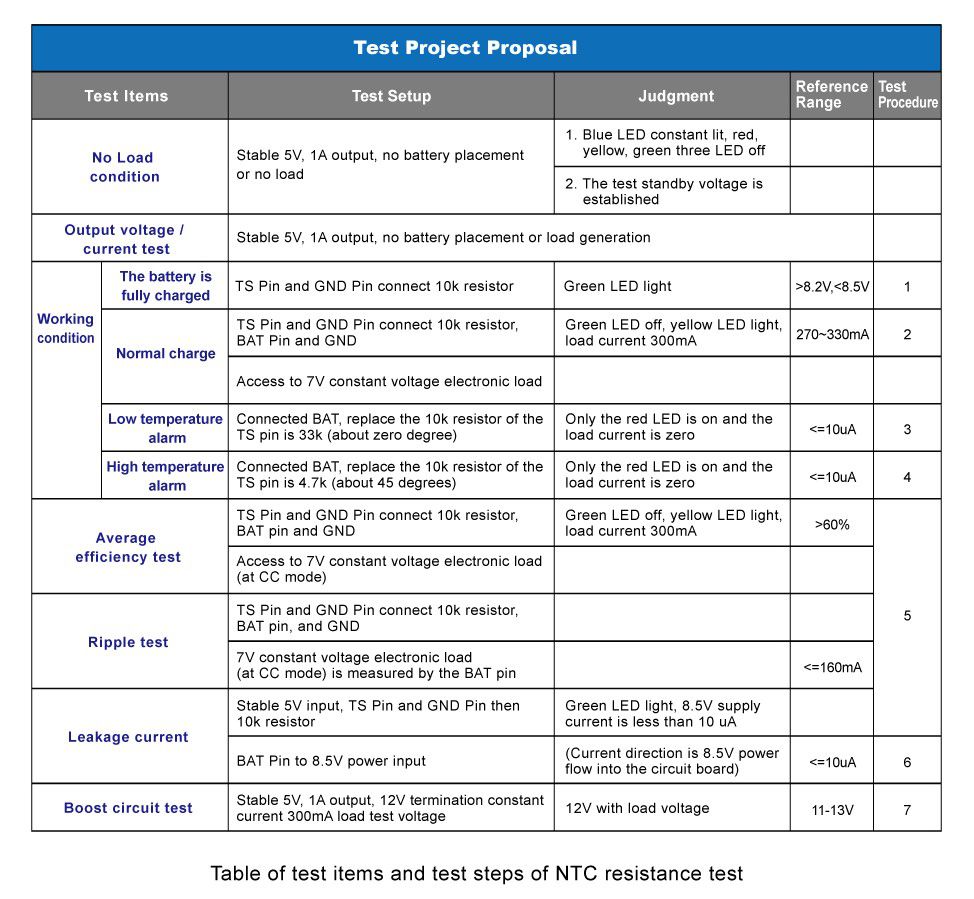 Prodigit’s new NTC simulator can simulate NTC resistance values change. Available ranges are from 100ohm-500Kohm, which is equal to - 46°C - + 179°C temperature range changes. The NTC simulator acts like a standard resistance box, consisting of a number of precision resistors, it can automatically output the required temperature resistance value. Thus, if the NTC simulator is connected to the NTC interface of the charger, it can simulate low temperature (0 deg C) or high temperature charging conditions. This enabled checking to see if the unit under test can stop charging according to the design criteria. Furthermore, it can also simulate when the temperature returns to the available temperature, such as from 0 deg C back to 5 deg C and return to charge normal charging. The following table shows the required general charger test items for temperature changes.