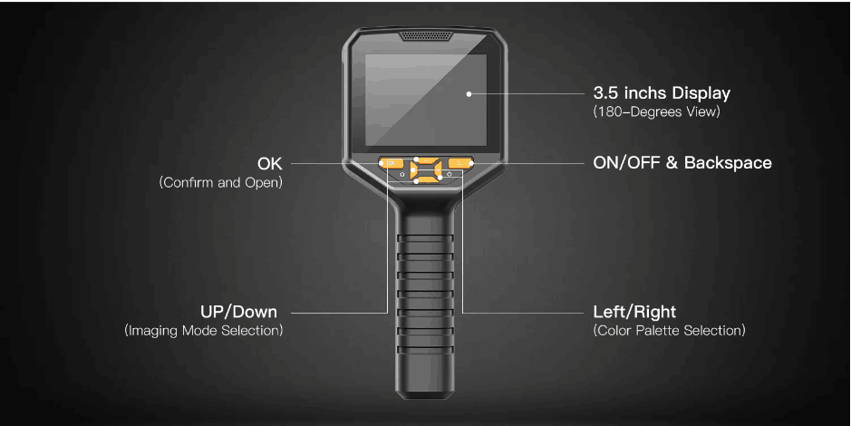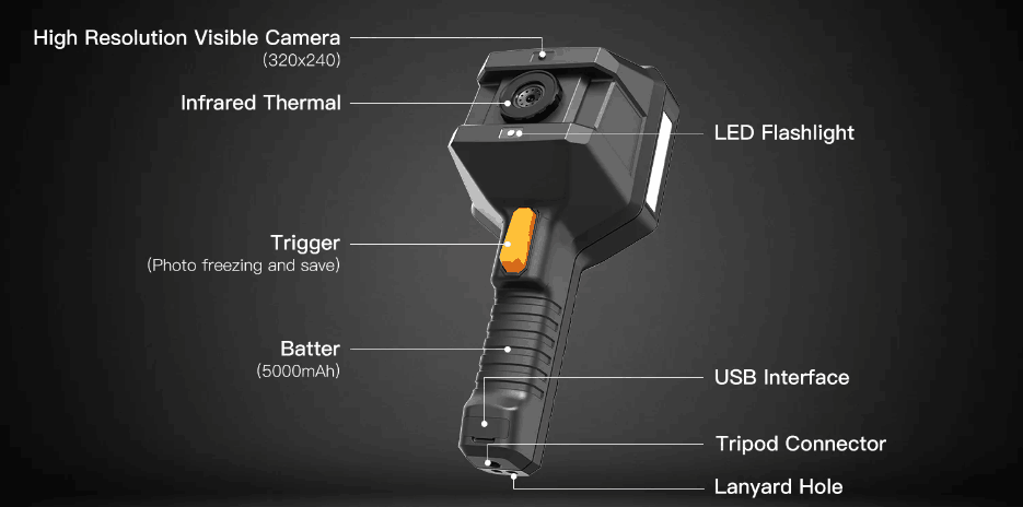 DP Series Handheld Infrared Thermal Imaging Device is a high-precision thermal imaging handheld device. Due to its infrared thermal imaging and HD camera synchronous display, the product is able to detect the temperature of the target object and image, thereby rapidly detecting the fault state of the target object. It can be widely applied in mechanical equipment testing, automobile maintenance testing, air conditioning maintenance, power cruise, equipment temperature troubleshooting and other scenes.