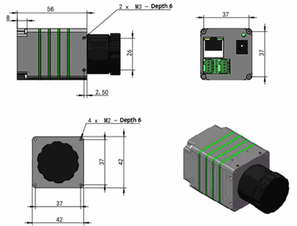 Installation:4 M2 side thread mounting holes, 2*4 M3 side thread mounting holes, with 1/4 UNC-20 PTZ adapter.