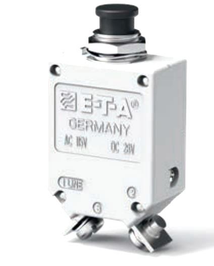 E-T-A Circuit Breakers 482-G334-J2M2-E3S0T-20A Thermal Single pole compact high performance thermal circuit breaker with tease-free, trip-free, snap action mechanism and push/pull on/off manual actuation (M-type TO CBE to EN 60934). An indicator band on the push button clearly shows the tripped/off posit