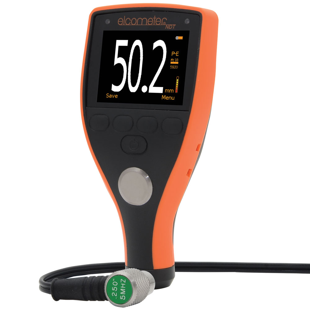 Packing List: Elcometer MTG4, 5MHz 1/4 right angle transducer, couplant, wrist harness, screen protector, protective case, 2 x AA batteries, calibration certificate, operating instructions
