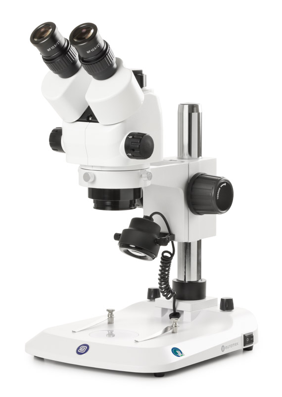 Ergonomically pillar stand. Maximum object height 193 mm. Supplied with black/white stage plate, transparent plate and 2 object clamps
