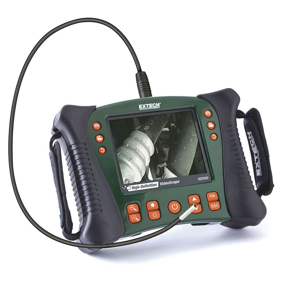 • VideoScope HDV600, SD memory card, 3.7V rechargable Li-Polymer battery, patch cable, Universal AC adapter (110-240V, four plugs), USB and AV cables, and hard carrying case