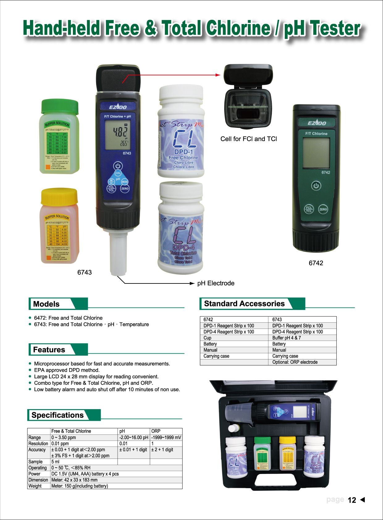Accessories: FCL Reagent strip x 50 pcs(DPD-1),TCL Reagent strip x 50 pcs (DPD-4), Battery, Cup, Carrying case.