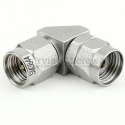 1.85mm to 2.92mm adapter is constructed with male gender on side 1 and male on side 2. SM3844 1.85mm male to 2.92mm male coaxial adapter from Fairview is a right angle body style. This right angle 1.85mm connector adapter is a 90 degree right angle RF elbow adapter design.
