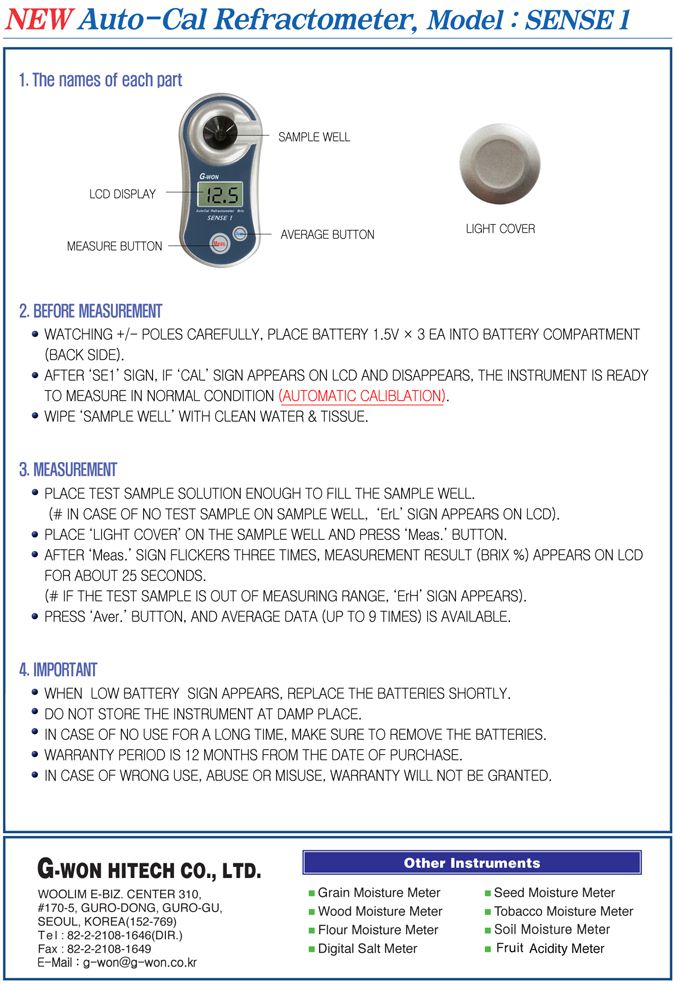 G-won SENSE I Auto-Cal Refractometer (0~53,0 Brix%, ± 0,2 Brix%) | EMINKH.COM