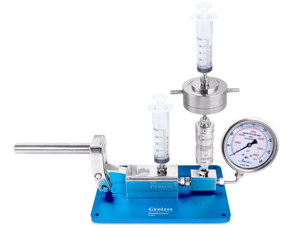 Compared to pneumatic or hydraulic liquid processors, the HandGenizer is an eco- and budget-friendly mini homogenizer. It is a manual high pressure homogenizer that works by shifting the pump handle up and down. It needs no PLC control system or electricity and is perfect for basic experimental tasks, particularly when handling small quantities of liquid samples.
