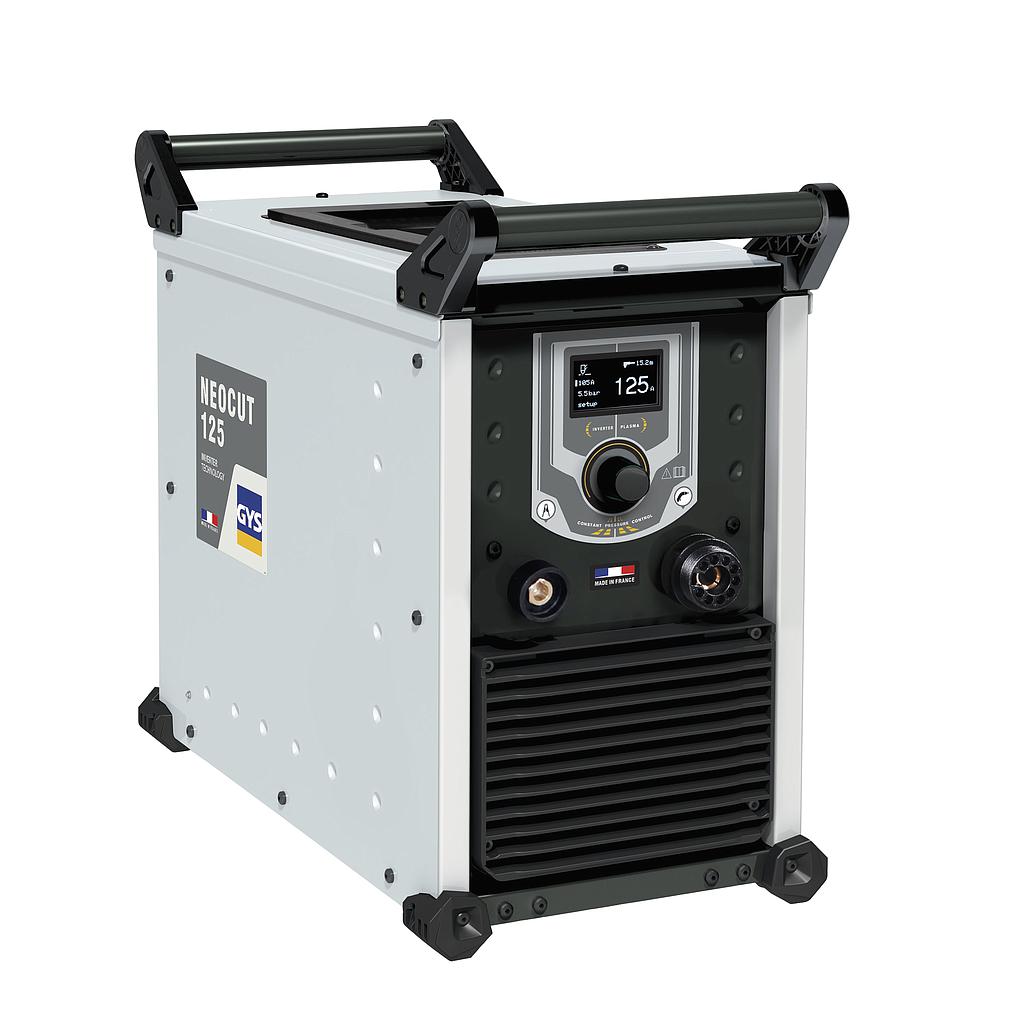 The NEOCUT 125 is a plasma cutter with a duty cycle of 100% at 125 A for cutting work up to 57 mm thick in industrial environment It is equipped with an automatic air pressure management, in all modes, offering an optimum cutting quality throughout the lifespan of the consumables. Also connectable to a cutting table, its «Marking» mode is perfect for tracing and identifying parts.