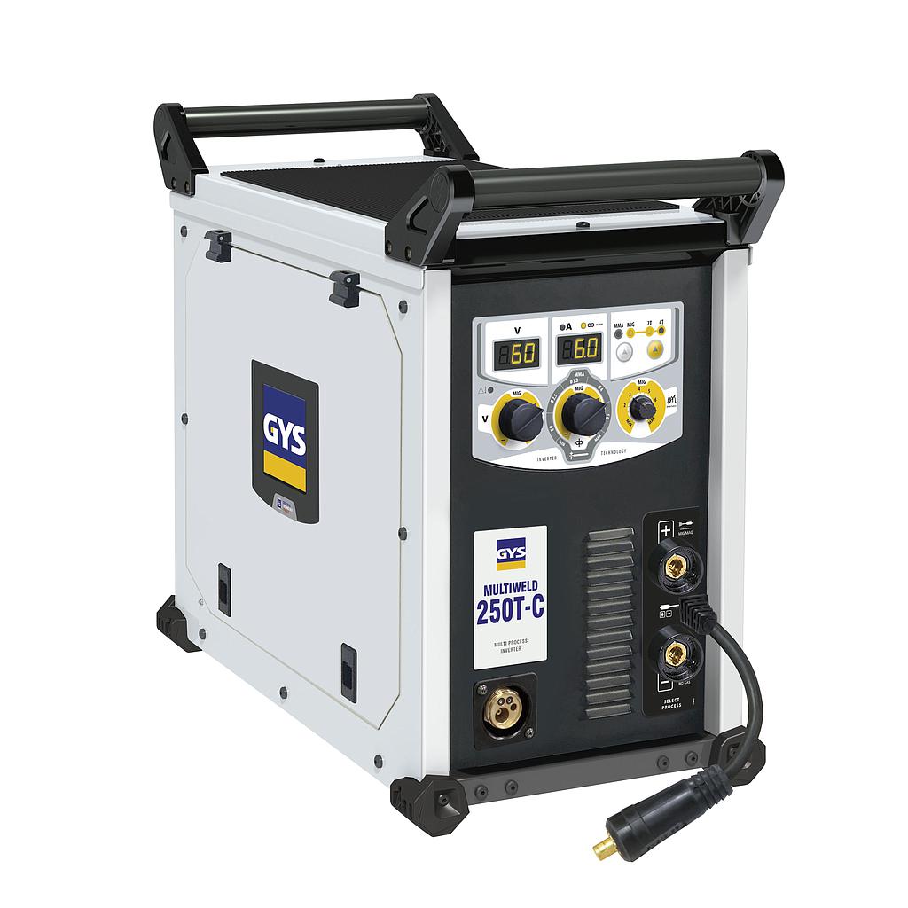 The MULTIWELD 250T-C is a compact three-phase generator combining MIG/MAG, cored wire and MMA welding processes. Its intuitive interface integrates digital displays for easy and precise settings. With a reinforced structure including 2 handles for lifting and slinging, the MULTIWELD 250T-C is perfectly suited for welding in the workshop and on site use.