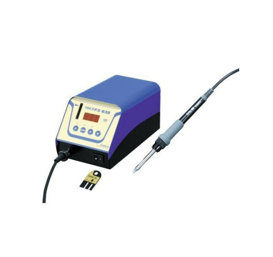 Packing List: Station (HAKKO FX-838), Handpiece (HAKKO FX-8301), Card, Power cord, Iron holder (With cleaning sponge and 599B), Connecting cable, Heat resistant pad, Instruction Manual