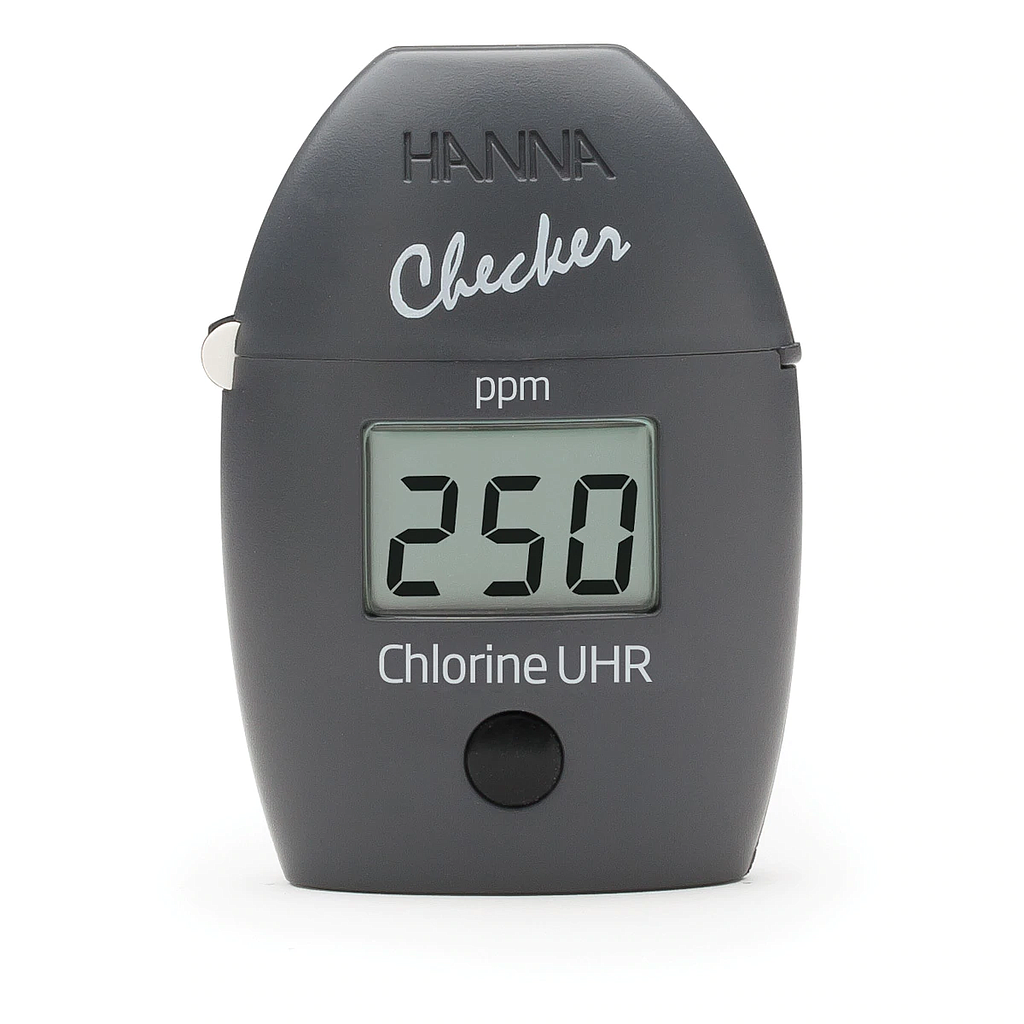 Ordering Information: HI771 Checker® is supplied with (2) sample cuvettes with caps, UHR chlorine reagent starter kit for 6 tests (6 powder reagent packets), battery, instructions and quick start guide