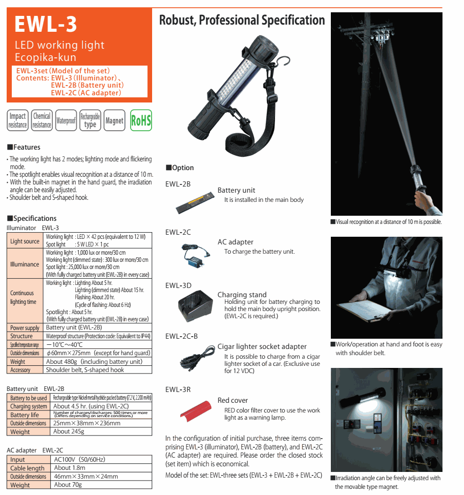 - Spotlight: About 5 hr. With fully charged battery unit (EWL-2B) in every case