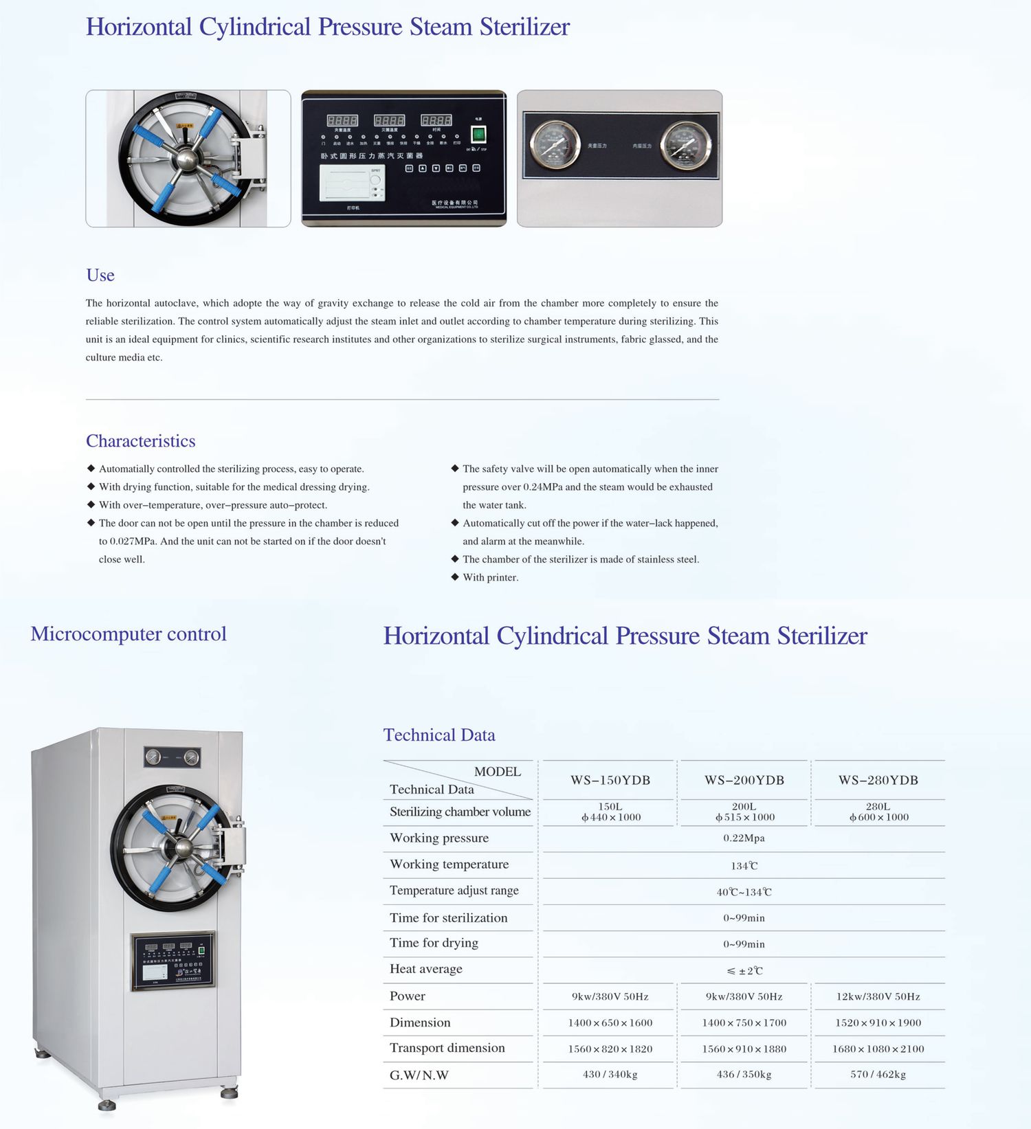 Sterilizing chamber /volume: 200L (φ515×1000mm)