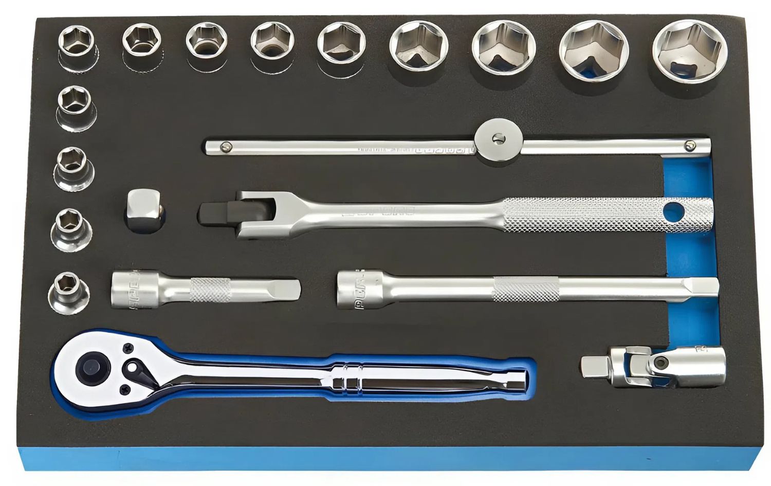 A set of sockets is a collection of sockets with different sizes, often accompanied by a wrench or supporting accessories. This tool helps tighten or loosen bolts and nuts quickly, accurately and with less effort than using a regular wrench. For jobs that require great force or continuous operations, a standard socket set will help save time and reduce damage a lot.