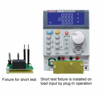 The 3341G series LED load module short output on the panel will drive the installed fixture board of the relay. The relay control of the contact point will cause the load's positive and negative input to short-circuit. This happens directly on the LED Driver s output to provide only a few mOhm of short-circuit resistance. It is used to verify correct operation of the test short circuit protection function