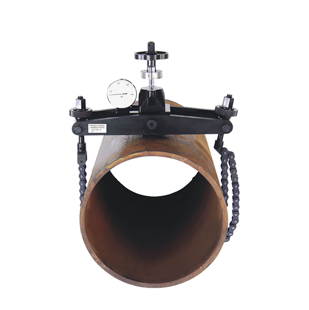 PHR Chain Clamp Rockwell Hardness Tester which can test the hardness of cylindrical workpieces such as pipes, shafts, rollers accurately on-site. The test principle and accuracy comply to standard ISO 6508 and ASTM E110. Tested by National Institute of Metrology with tolerance <1.5HRC, equivalent to bench hardness tester. So this kind of manual Rockwell hardness tester is usually used for manufacturing inspection and acceptance inspection to replace Leeb hardness tester with lower accuracy.