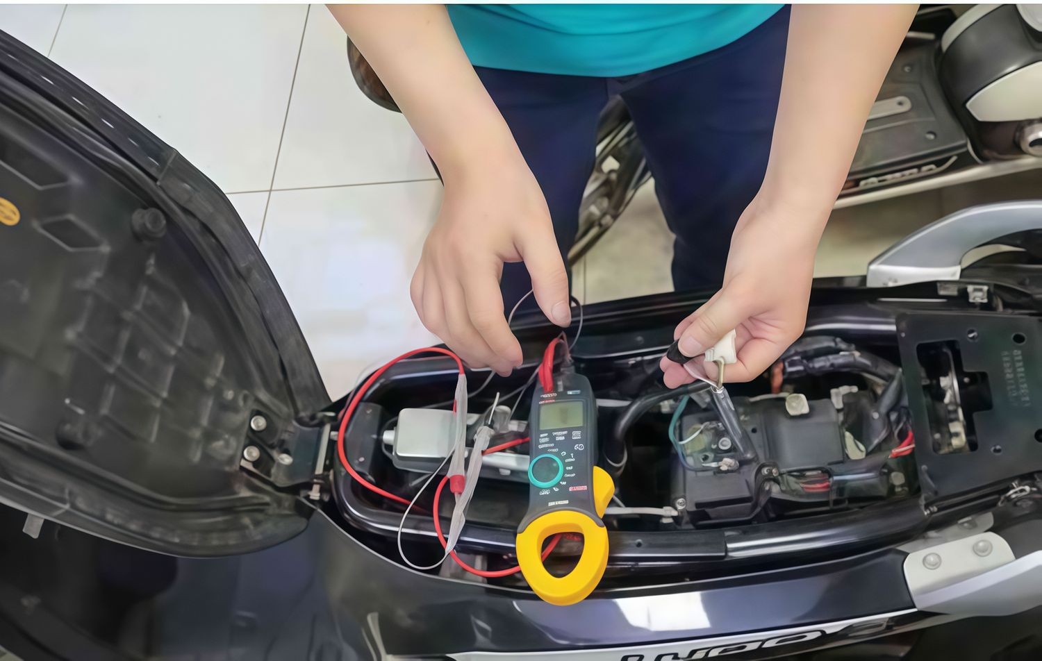 - If the voltage is low, fluctuates abnormally, or doesn't increase when the engine starts, the charging system needs to be checked. For a quick and accurate check of the electrical system, a multimeter such as the SANWA PM33A can be used to measure the battery voltage, combined with a clamp meter like the Hioki CM3289 to check the charging current without disconnecting the wires, thus detecting abnormalities during operation early.