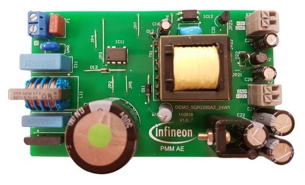 Infineon DEMO5QR2280AZ24W1TOBO1 AC/DC Primary/Secondary Side Controller - Flyback The DEMO_5QR2280AZ_24W1 demostration board operates under a wide range input developed with offline SMPS application in mind. It features the new ICE5QR2280AZ PWM quasi-resoant flyback CoolSET with 800V integrated MOSFET in DIP-7 package.