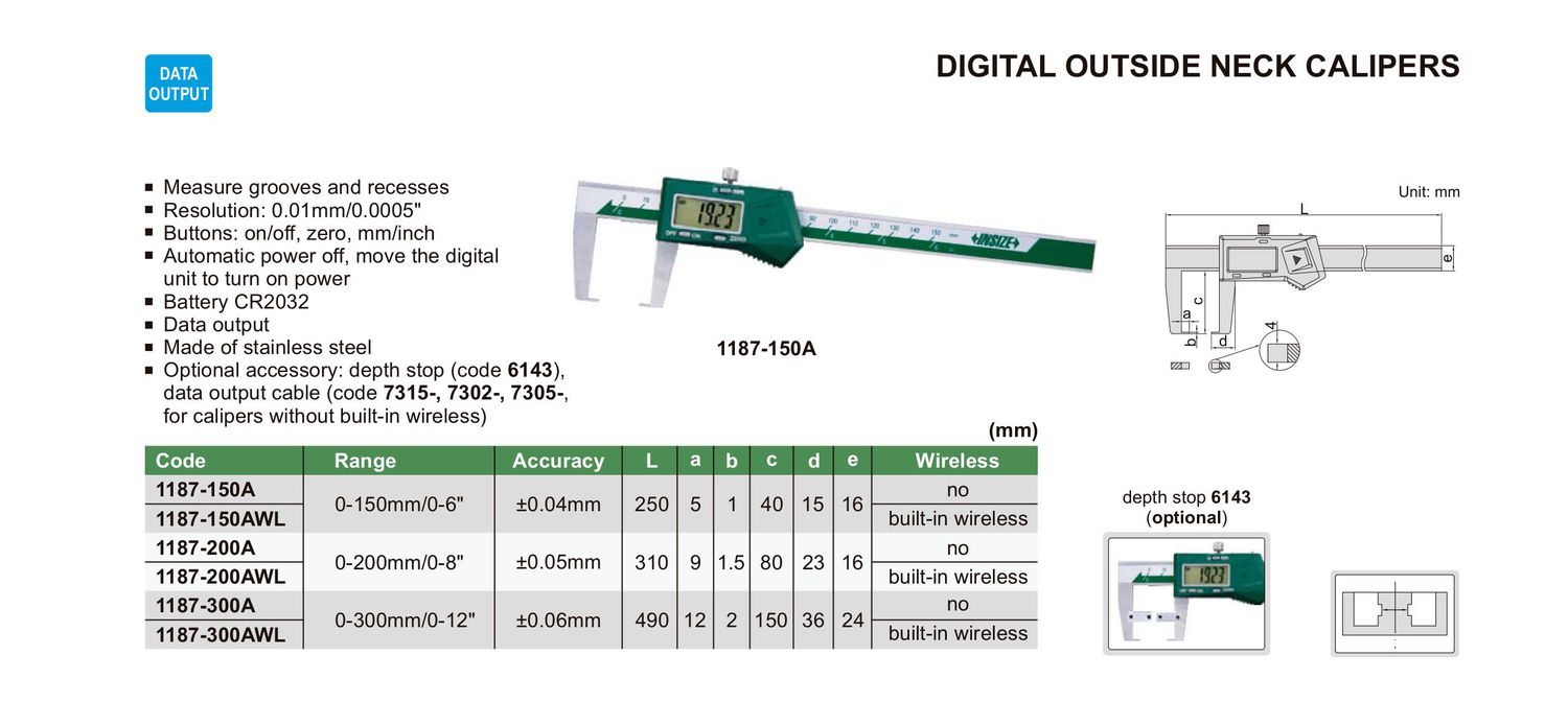 INSIZE 1187-200A Built-In Wireless Digital Outside Neck Caliper (0-200mm/0-8") | EMINKH.COM
