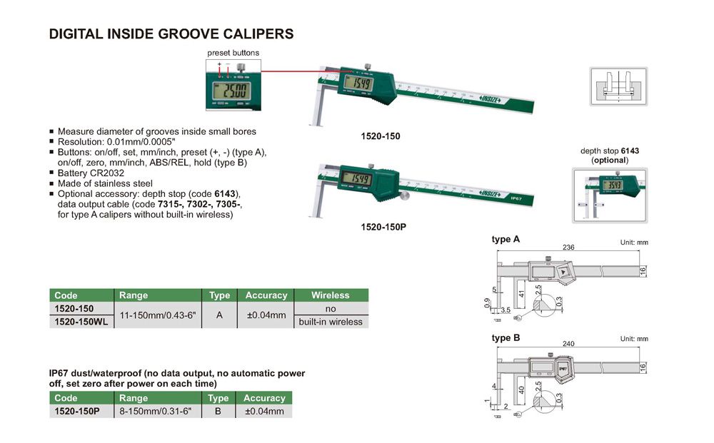 INSIZE 1520-150P Digital Inside Groove Caliper (8-150mm/0.31-6"; ±0.04mm; 0.01mm/0.0005") | EMINKH.COM