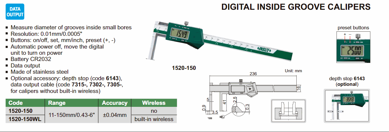INSIZE 1520-150WL Digital Inside Groove Caliper (11~150mm; Built-in wireless) | EMINKH.COM
