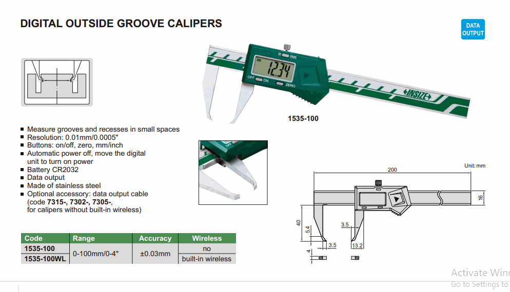 INSIZE 1535-100WL Digital Outside Groove Caliper (0-100mm/0-4”; 0.01mm/0.0005”; built-in wireless) | EMINKH.COM