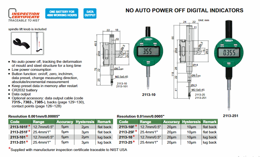 INSIZE 2113-251F No Auto Power Off Digital Indicator (25.4mm/1"; 0.001mm/0.00005") | EMINKH.COM