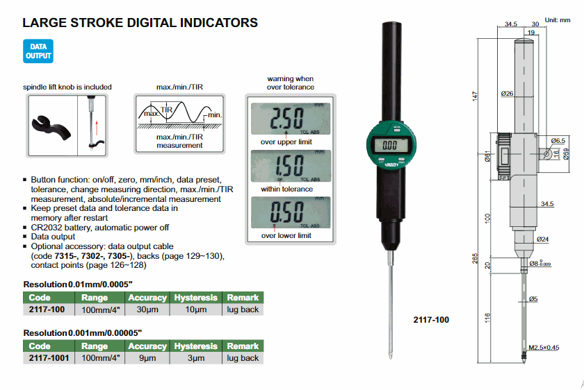 INSIZE 2117-100 Large Stroke Digital Indicator (100mm/4"; 0.01mm/0.0005mm) | EMINKH.COM