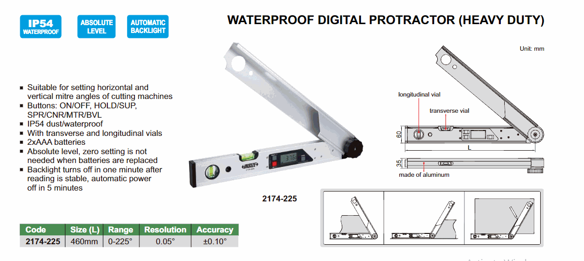 INSIZE 2174-225 Waterproof Digital Protractor (Heavy Duty) (0~225°) | EMINKH.COM