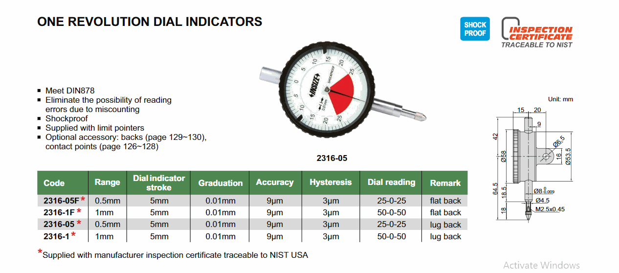 INSIZE 2316-1 One Revolution Dial Indicator (1mm; llug back) | EMINKH.COM