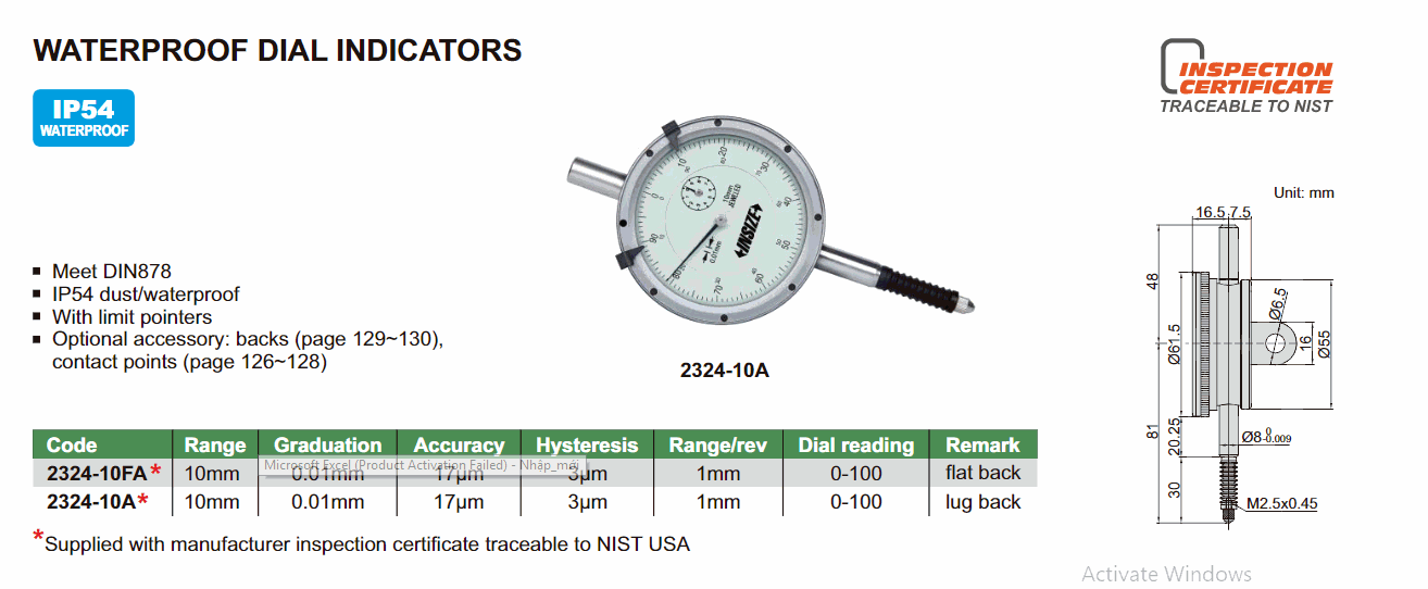 INSIZE 2324-10A Waterproof Dial Indicator (10mm; 0.01mm) | EMINKH.COM