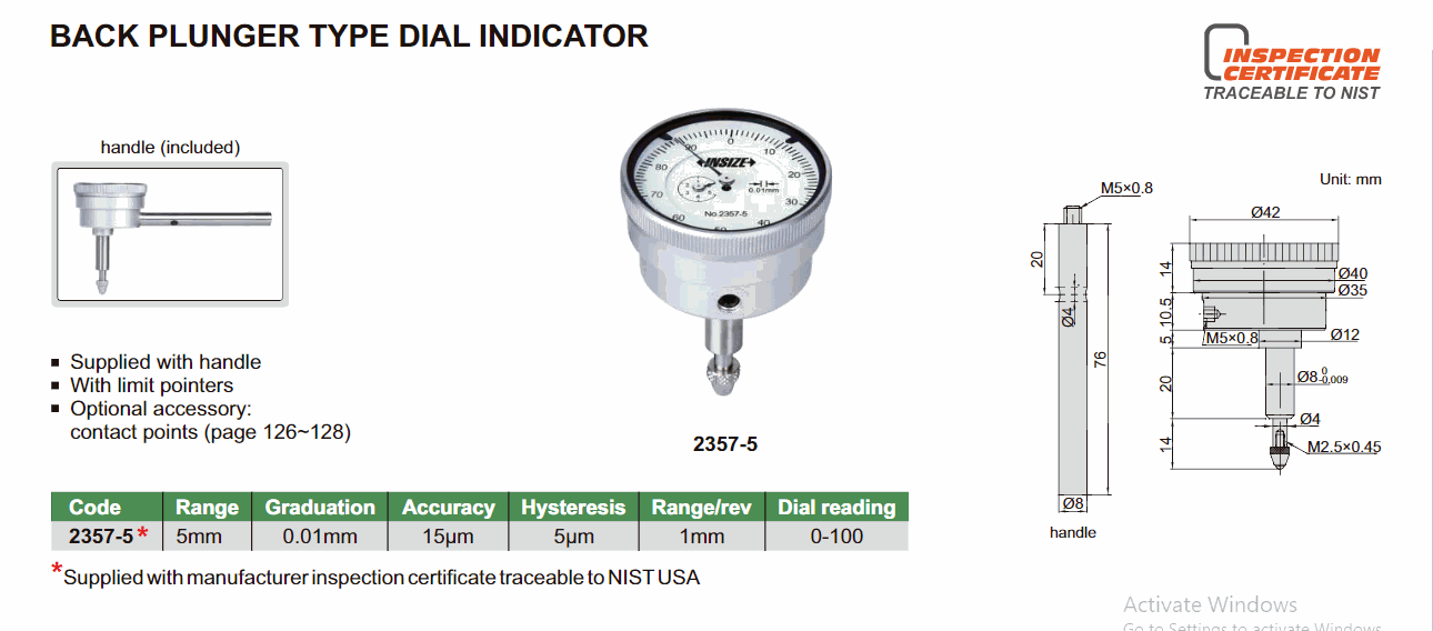 INSIZE 2357-5 Back Plunger Type Dial Indicator (5mm; 0.01mm) | EMINKH.COM