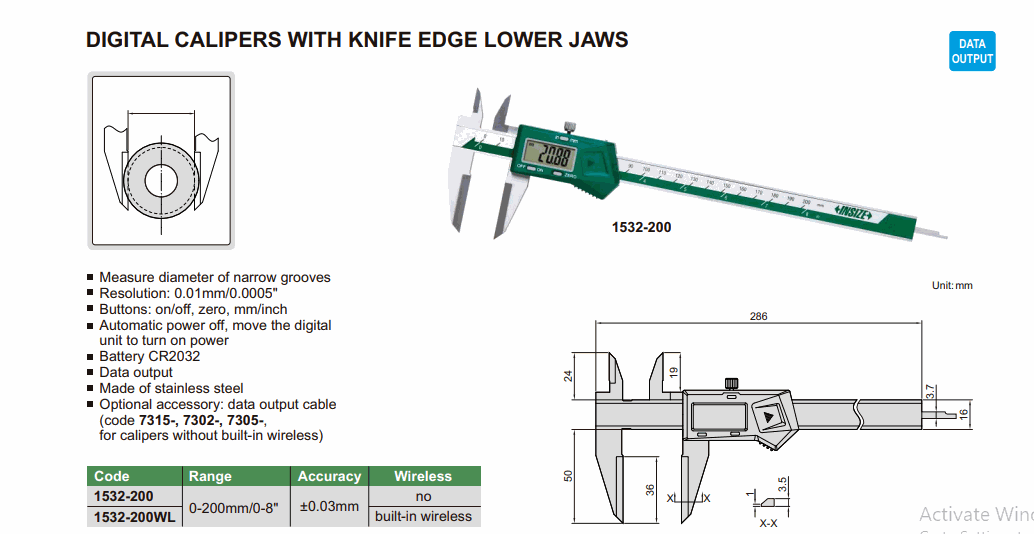 INSIZE 2532-200WL Digital Caliper With Knife Edge Lower Jaws (0-200mm/0-8”; 0.01mm/0.0005”; Built-in wireless) | EMINKH.COM