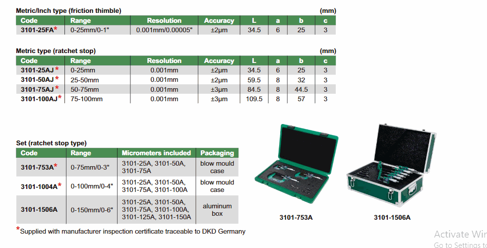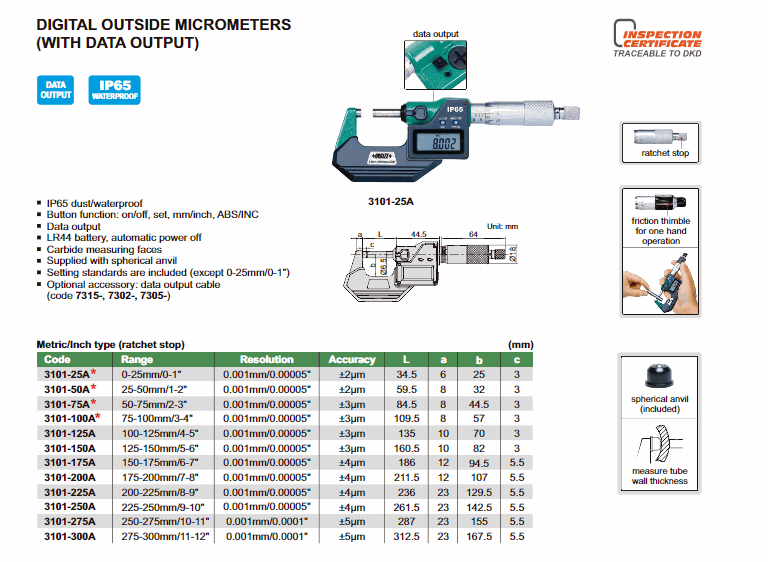 INSIZE 3101-1506A Digital Outside Micrometer Set (0-150mm/0-6"; With data output) | EMINKH.COM