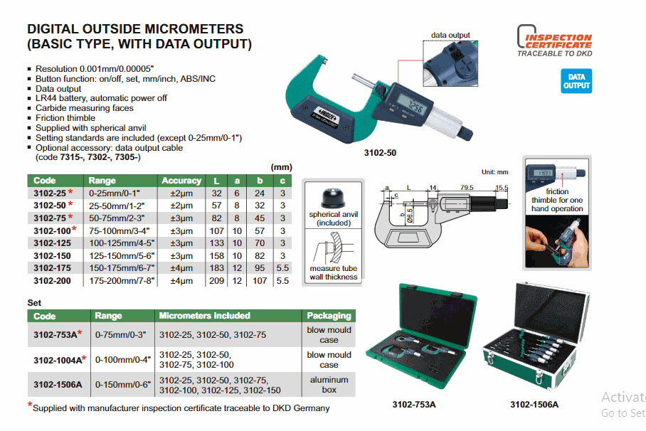 INSIZE 3102-125 Digital Outside Micrometer (100-125mm/4-5"; ±3µm; Basic type; With data output) | EMINKH.COM