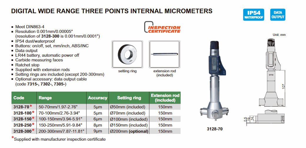 INSIZE 3128-300 Digital Wide Range Three Points Internal Micrometer (200-300mm/7.87-11.81") | EMINKH.COM