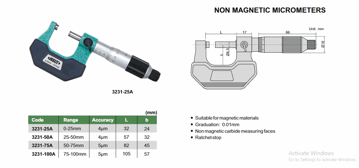 INSIZE 3231-50A Non Magnetic Micrometer (25-50mm; 0.01mm; 4µm) | EMINKH.COM