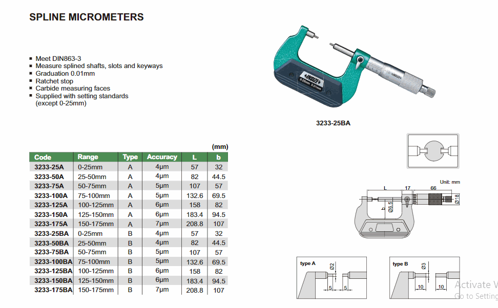 INSIZE 3233-150BA Spline Micrometer (125-150mm; 0.01mm; 6µm) | EMINKH.COM