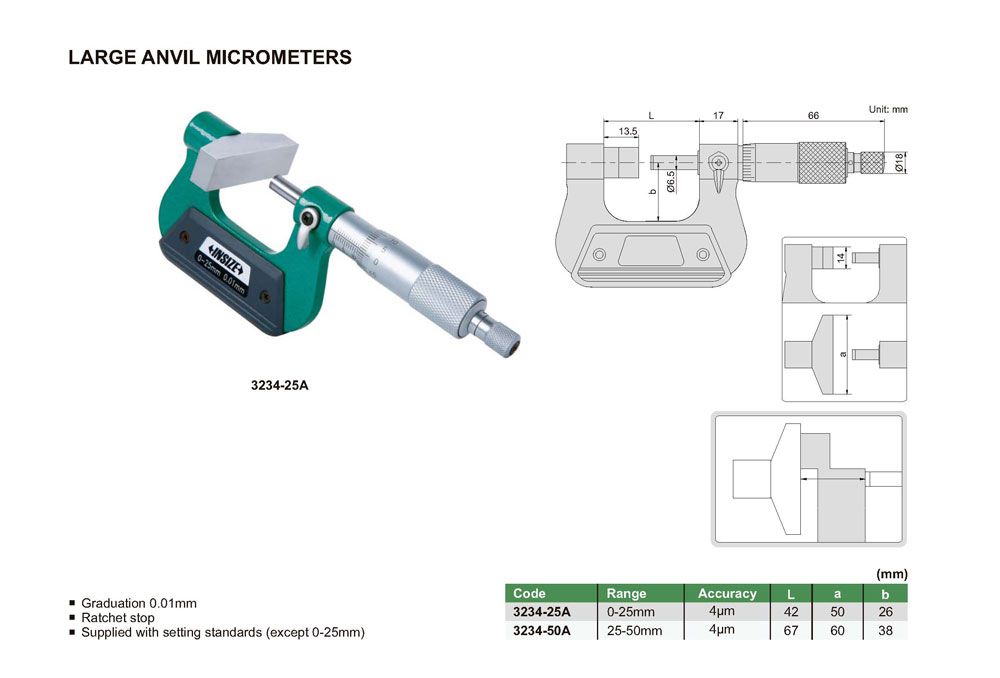 INSIZE 3234-25A Large Anvil Micrometer (0-25mm; 0.01mm) | EMINKH.COM