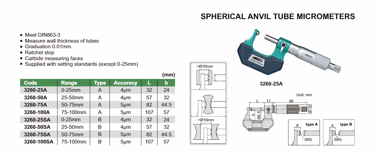 INSIZE 3260-75A Spherical Anvil Tube Micrometer (50-75mm; 0.01mm; type A) | EMINKH.COM