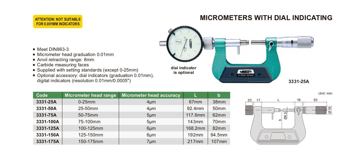 INSIZE 3331-75A Micrometer With Dial Indicator (50-75mm) | EMINKH.COM